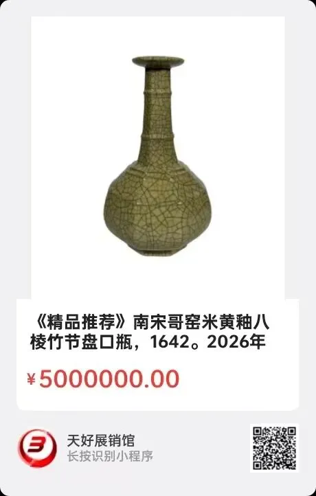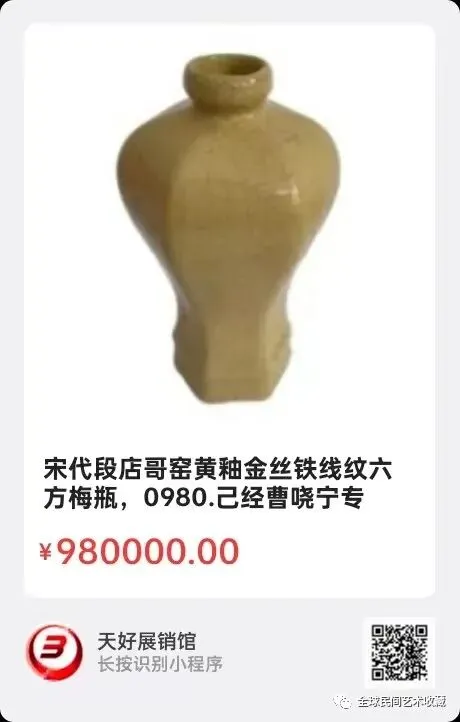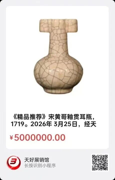宋黄哥釉贯耳瓶,瓶高11厘米,该瓶造型优美,小巧玲珑,胎体较厚,釉质肥厚亮丽,采用铁胎制作方式。全手工制作,修足规范精细。胎质坚硬,是标准宋代哥窑的制作方式。釉面经过几百年的蒼伤釉面有细腻的深浅开片,金丝铁线明显,整体包浆醇厚自然到代!是件难南宋时期的贯耳小瓶真品,珍品!精品!全美品!罕见的品种!该瓶采用原始盒包装,是件传承有序的回流藏品。根据例年国内拍买成交的保守价。2026年 3月25日,经天好评审团评审,以8票优势荣登精品榜,获第203期天好海选精品。来源1719.V。
