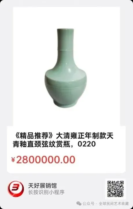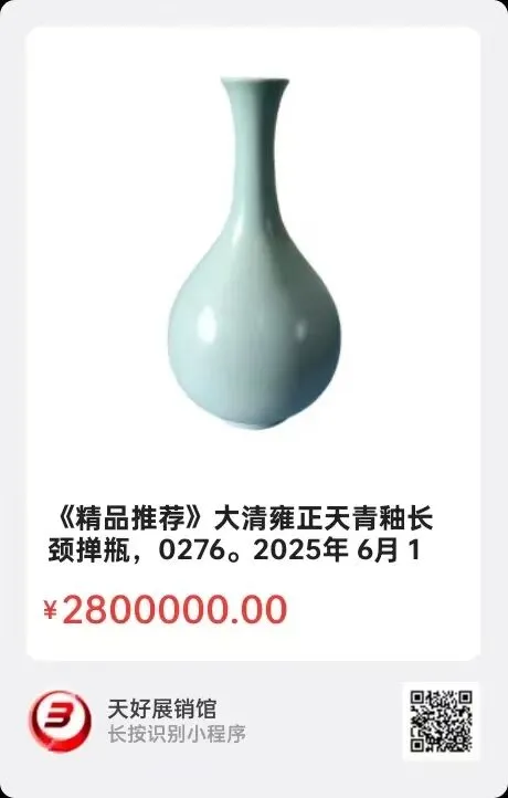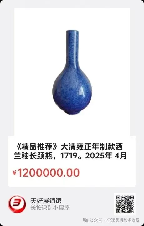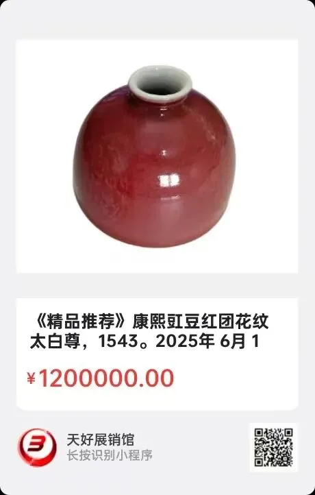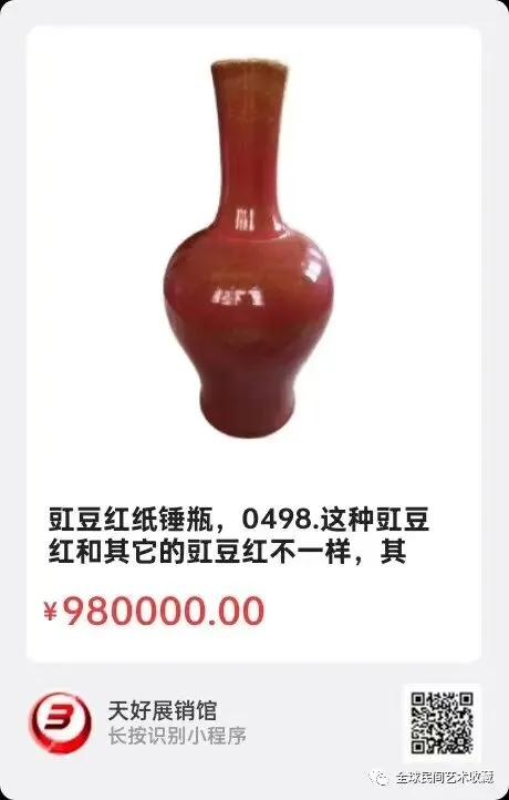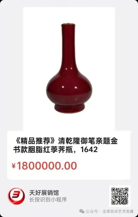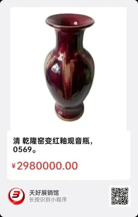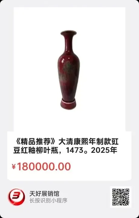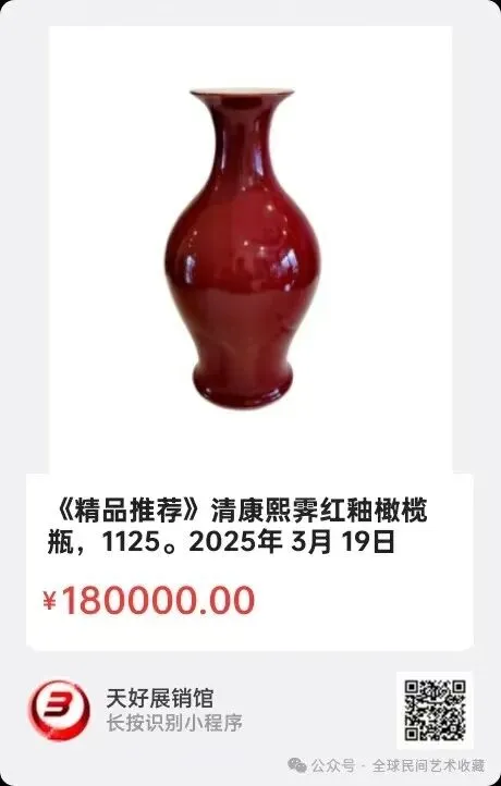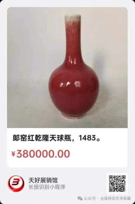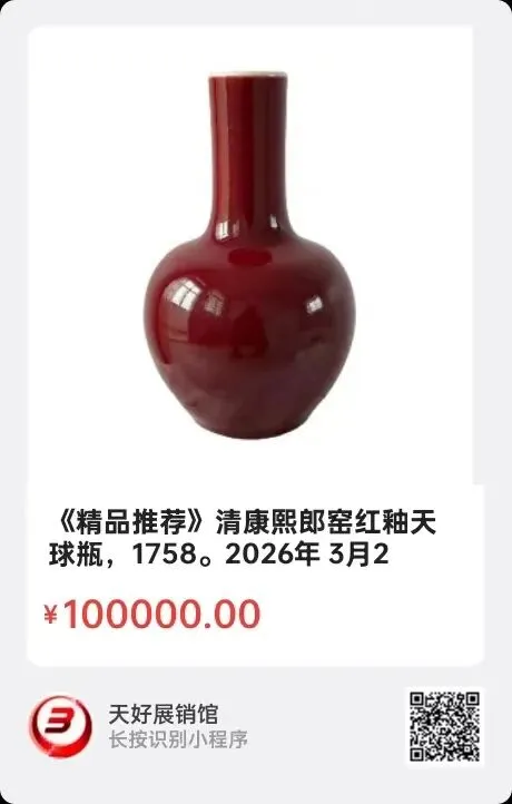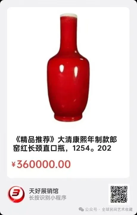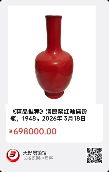 清郎窑红釉摇铃瓶,高约37cm。口径约6cm。底部约11cm。是清代康熙至雍正时期官窑经典器型,特征为:细长直颈、丰肩、圆腹、圈足外撇,整体形似古代摇铃,线条端庄秀雅。釉色:通体施郎窑红釉(或霁红釉),属于高温铜红釉,釉色浓艳鲜亮,玻璃质感强,口沿因釉层薄呈现“灯草边”(图中为描金装饰),符合“脱口垂足郎不流”,的郎窑红典型特征。釉层肥厚,垂流自然,底部釉色略深,口沿描金,提升了装饰性与华贵感。内部与底足:瓶内施淡清釉,底足内‘施青白釉,底心落**“雍正年制”四字双行青花楷书款**,外围方框,字体规整,雍正郎窑红存世极少,收藏价值极高。2026年 3月18日,经天好评审团评审,以6票优势荣登精品榜,获第202期天好海选精品。来源1948。