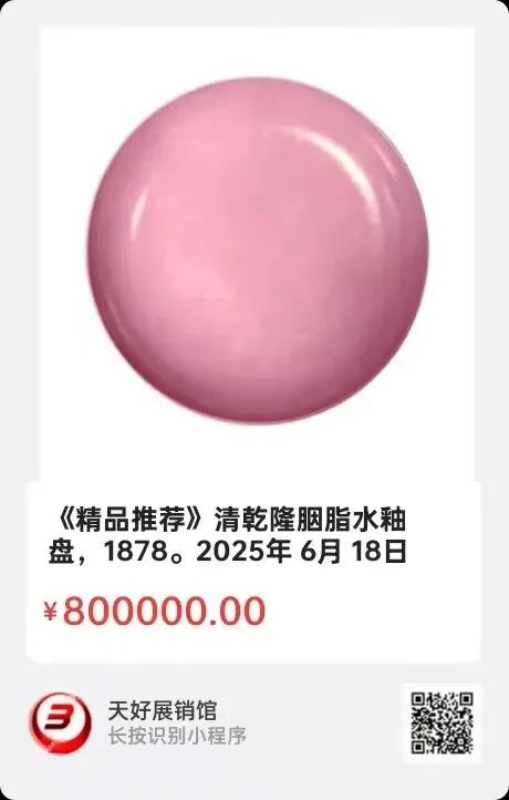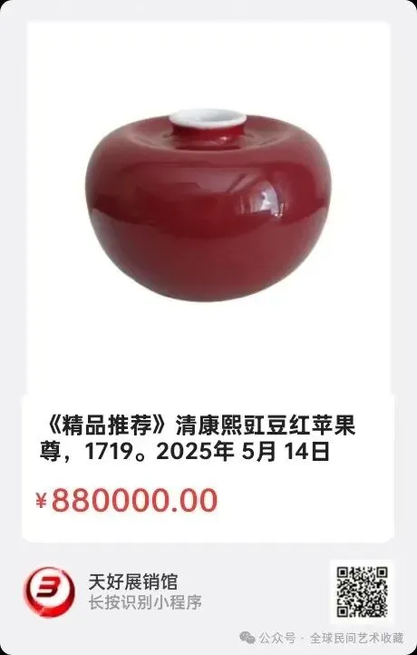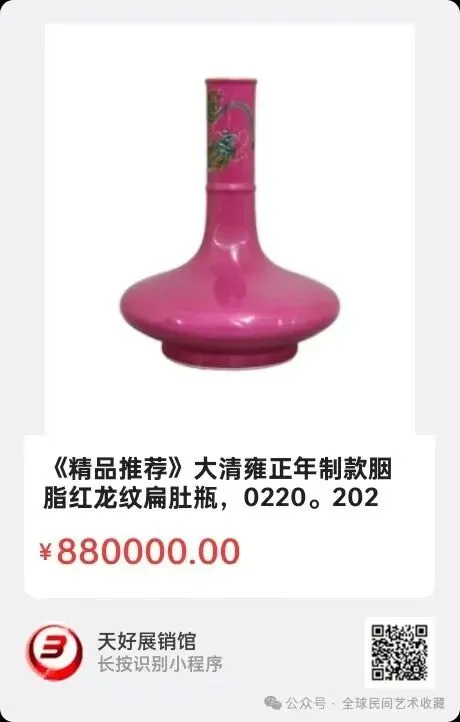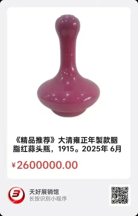 清代雍正胭脂红梅瓶,胭脂红是一种以金为呈色剂的低温釉彩,釉色如胭脂般浓艳柔润,深浅过渡自然,釉面光润如宝石,又有洋红或金红之称,是吸收西方珐琅彩制作工艺的成果。这枚雍正时期(1723一1735年)的胭脂红梅瓶,发色非常柔润艳丽,造型挺拔秀美,线条流畅,典型特征为小口、短颈、丰肩、弧腹渐收至底,其底是修胎为玉壁底,胎土紧密细致,底圈以青花书写双圈"大清雍正年制"六字楷书,字体工整秀丽有力,整个梅瓶优雅端庄,属官窑之珍品。尺寸:高23X肚径14X底是8.5Cm,2025年 3月 26日,经天好评审团评审,以6票优势荣登精品榜,获第164期天好海选精品。来源1125.V.