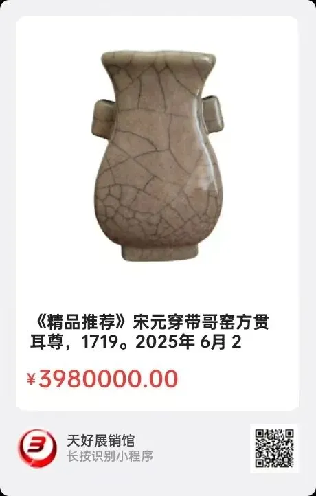 宋元穿带哥窑方贯耳尊,该尊造型小巧精致,釉质肥厚亮丽润泽,金丝铁线明显,开片富有年代层次感。足底是铁胎制试,修足规范,穿带孔制作精致。整体包浆厚重自然开门到代!穿带型小型哥窑方贯耳尊实属罕见。属于宋元时期哥釉真品:精品:全美品!2025年 6月 25日,经天好评审团评审,以6票优势荣登精品榜,获第176期天好海选精品。来源1719.V.