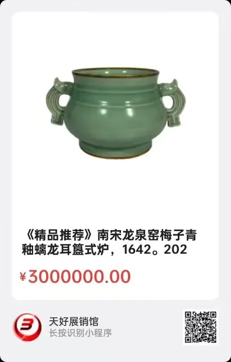 南宋龙泉窑梅子青釉螭龙耳簋式炉,藏品尺寸:高11cm 宽20.5cm,该簋式炉敞口、束颈、鼓腹、圈足,两侧塑夔龙形双耳,颈部饰两道弦纹,是宋代龙泉窑模仿青铜礼器的经典制式,原本是古代的礼器,后世多作香炉使用。龙泉窑是宋代五大名窑之外的南方青瓷名窑,核心窑址在今浙江龙泉,以粉青、梅子青釉为巅峰代表。釉面通体施青釉,莹润肥厚,光泽柔和,是龙泉窑典型的厚釉工艺特征。其口沿包金,圈足露胎处呈火石红,这是紫金土胎的特征,底足刻金彩御题诗,是典型清代宫廷对古瓷的二次工艺。底款御题为乾隆御题诗,记录了乾隆四十九年,说明这件器物曾入藏宫廷,被乾隆皇帝鉴赏并题诗刻款。2026年 4月8日,经天好评审团评审,以7票优势荣登精品榜,获第205期天好海选精品。来源1642.V。