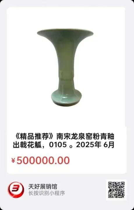 南宋龙泉窑粉青釉出戟花觚,高15厘米 口径11.5厘米 底径6.5厘米,胎质灰白,器身出戟处和圈足露胎处均有火石红泛出,整器造型匀称美观,犹如一枝出水芙蓉亭亭玉立,花觚属于供器,青瓷又具有玉石般的柔和温润感,南宋时期创烧出了粉青和梅子青的釉色,符合南宋时期上流社会的审美情趣,深受皇宫贵族们的喜爱,整器完整无缺流传至今实属不易,己经天好专家团鉴定为南宋龙泉窑的粉青釉出戟花觚,2025年 6月 11日,经天好评审团评审,以6票优势荣登精品榜,获第174期天好海选精品。来源0105。