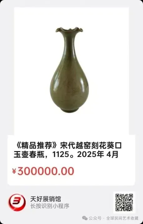 宋代越窑刻花葵口玉壶春瓶,越窑青瓷以釉色青翠、釉面柔润,质地细腻、造型优美著称,是中国古代青瓷的代表之一。此件宋代越窑刻花葵口玉壶春瓶,釉色为青(綠)翠色,釉面光滑柔润,有玉质感,其釉色呈現出"千峰翠色”的独特美感。其壶口为五辨葵口,长颈弧腹,壶身刻花牡丹花缠枝纹,简练流畅优雅,整个玉壶春瓶造型线条流畅高雅,是越窑青瓷的经典器型,十分珍贵,有极高的鉴赏和收藏价值。尺寸:高26x肚径14cm,2025年 4月 16日,经天好评审团评审,以6票优势荣登精品榜,获第167期天好海选精品。来源1125.V.