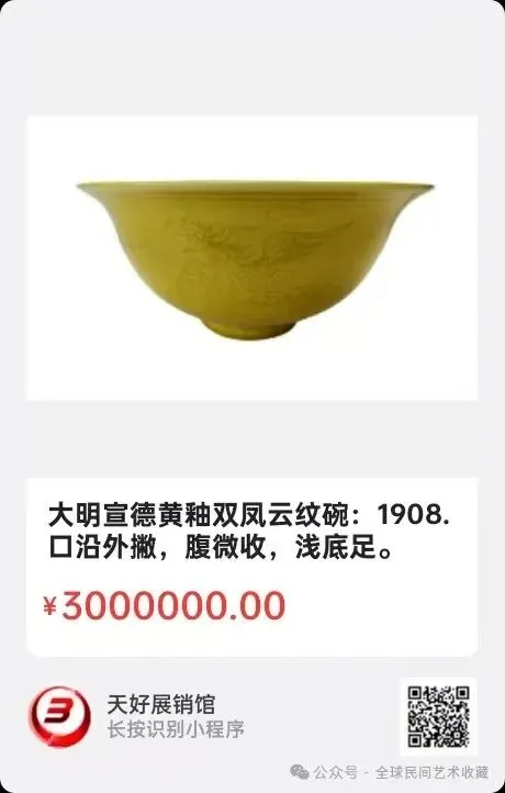 大明宣德黄釉双凤云纹碗:上口沿直径15.5厘米,底足直径6厘米,高7.5厘米。口沿外撇,腹微收,浅底足。外壁对称性两只划花凤凰,云宝纹散布其间,碗心中央有宝纹花饰,纹饰有凹凸感。黄釉肥润,黄中略显姜黄,胎质细腻坚硬,开片自然有力,呈网格状态。足底双排书“大明宣德年制;墨黑落款,字瘦遒劲。器身气泡稀疏,足甚密,且有变色气泡,腐蚀斑和缩釉坑点。来源1908.V.