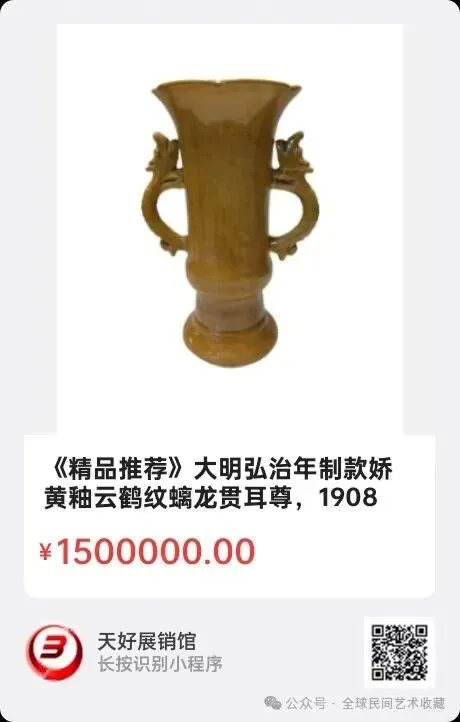 大明弘治年制款娇黄釉云鹤纹螭龙贯耳尊,高25.4厘米,上口沿直径13.5厘米,底足直径8厘米,造型独特,胎质细腻,七层纹饰,撇口浅足,釉色饱满,开片均匀(足底边沿似冰裂纹开片,瓶身开片似网格纹),黄釉无气泡,有分布不均的小黑点(疑是柴灰点)和小白点(脱釉腐蚀斑)及缩釉坑,足底有大小不均气泡,釉下青花气泡密布和变色泡缩釉坑点,上手有汗湿感,侧看有哈唎光。2025年 3月 19日,经天好评审团评审,以6票优势荣登精品榜,获第163期天好海选精品。来源1908.V。
