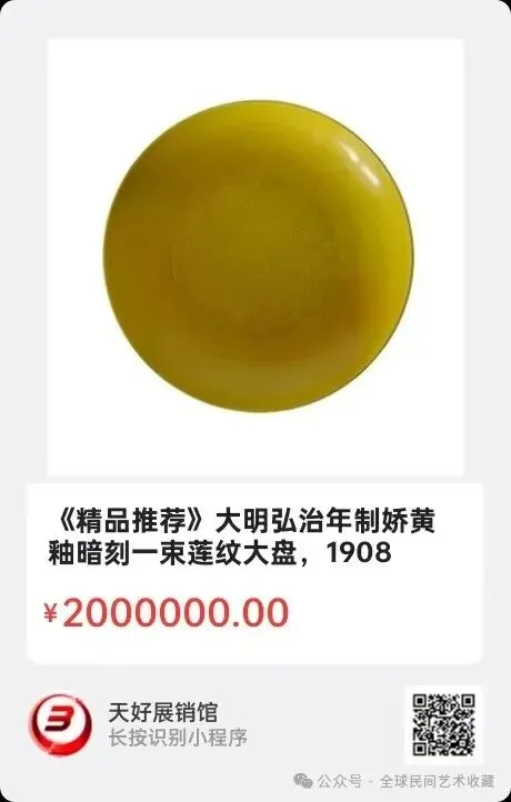 大明弘治年制娇黄釉暗刻一束莲纹大盘,上口沿直径22厘米,下口沿直径13.5厘米,高4.5厘米。口沿内收,外壁对称性云纹,盘心中央有划花一束莲纹饰,纹饰有凹凸感。黄釉肥润,胎质细腻坚硬,开片自然有力,呈网格状态。足底双排书“大明弘治年制''落款,字瘦遒劲。器身气泡稀疏,足甚密,且有变色气泡,腐蚀斑和缩釉坑点。2025年 4月 16日,经天好评审团评审,以6票优势荣登精品榜,获第167期天好海选精品。来源1908.V.