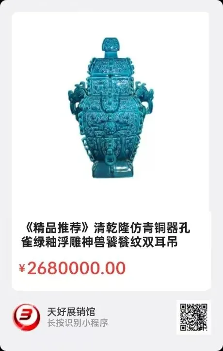 清乾隆仿青铜器孔雀绿釉浮雕神兽饕餮纹双耳吊环四方尊,高度44cm:口径12.1cm:底径13.4cm。2025年 6月 25日,经天好评审团评审,以6票优势荣登精品榜,获第176期天好海选精品。来源1792.V.