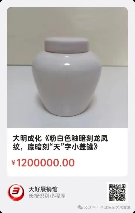 大明成化《粉白色釉暗刻龙凤纹,底暗刻“天”字小盖罐》,高10.5㎝,口径5.5㎝,底径7㎝。简介:以上粉白色釉暗刻龙凤纹、天字罐是大明成化年制作的髙级艺术品,与甜白釉暗刻龙凤纹杯一脉相承,超薄胎质细腻,十分轻盈,刻划图案工艺在烧制前操作,需精心雕琢,出品率极低,所以说成化年间宪宗皇帝为了制作精品瓷器,不惜代价血本,如此天子罐遗存至今,实属珍罕艺术品!来源1510.V.