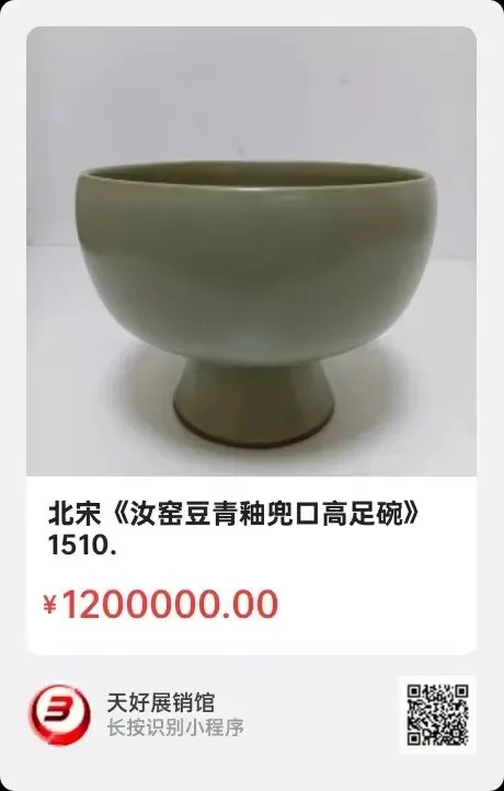 北宋《汝窑豆青釉兜口高足碗》,高10.3㎝,口径13㎝,足底径7.3㎝。简介:上述《汝窑豆青釉兜口高足碗》系宋代汝窑瓷器稀有品。据北宋文献记载,中国新石器时代就有了高脚碗(杯),到了宋代始称“高圈足碗”。此件汝窑高足碗,胎质坚实,豆青釉色,釉色温润,细腻,圈足短撇口,有稳重感。碗沿兜口,突显实用性优点。器型端庄雅气,是宋代宫廷用器的精品。来源1510.V.