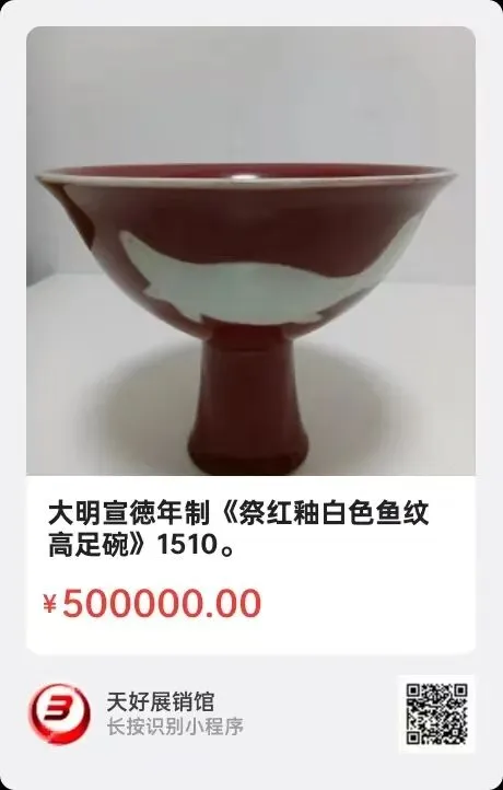 大明宣徳年制《祭红釉白色鱼纹高足碗》,高12.3㎝,口径15㎝,足底径5.5㎝。4.简介:大明宣徳年制《祭红釉白色鱼纹高足碗》,碗内外满祭红色釉,艳丽唯美,碗沿口露白,碗外邦三条白色鱼纹,充满美感。此器胎质细腻,碗口偏立,流线收底,碗足以釉连接,高足圈内壁兰色楷书:“大明宣徳年制”落款。此高足碗经历数百年风霜,釉色保持如此艳丽,十分珍贵!具有极高的历史文化价值!来源1510.V.