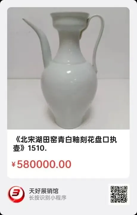 《北宋湖田窑青白釉刻花盘口执壶》,高20㎝,口径6㎝,底径4.7㎝,腹宽12.8㎝。简介:此执壶青白色釉,也称白釉泛青,釉下刻花,刀法飘逸流畅,有“釉里藏花”的朦胧美感!胎底未施釉泛褐黄色,胎薄,胎质坚实,精细,釉厚光泽如镜,具玉质美。壶盘口,把儿与盘口壶肩相连,水流长、细,器型端庄优雅!宋代薄胎非芒口贡御青白釉壶,极为罕见,十分珍贵!来源1510.V.
