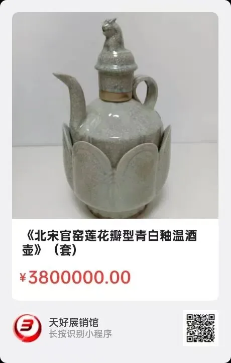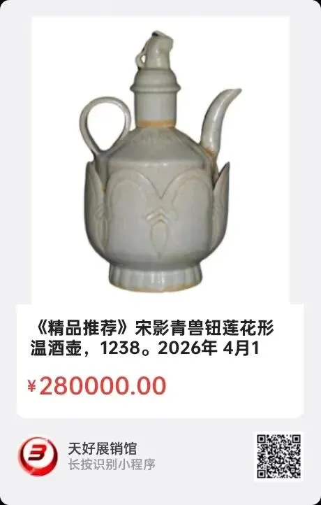 《北宋官窑莲花瓣型青白釉温酒壶》(套)温酒器:高27.5㎝,口径15.5㎝,底圈足径10㎝。酒壶:高24㎝,口径3.5㎝,底径9.5㎝。简介:温酒器自古有之,北宋时期,随之商品经济繁荣,饮酒文化兴盛,温酒习俗普及。景德镇湖田窑凭借高超的制瓷技艺,烧制了一批如上述温酒壶、温碗套用的酒器,造型典雅秀美,特别是当时盛行的莲花瓣式注碗,通水浴温酒,体现了宋代造物的智慧与生活实用的完美结合。此瓷器由壶碗一套构成,釉色青白泛灰,光亮莹润,壶面开片随部位不同而大小不规则。温碗直壁深腹,便多盛热水速加热,外观如一捧莲花开放,使人畅饮醉美中,仍能赏心体会吉祥之寓意!来源1510.V.