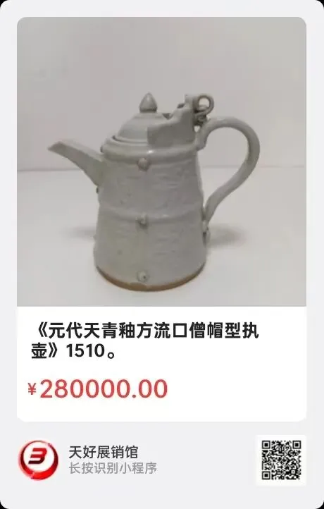 《元代天青釉方流口僧帽型执壶》,高14.5㎝,口径7㎝,底径9㎝。简介:上述元代僧帽壶,反映了彿教艺术与汉族文化的融合现象,到了明清,多有宫廷作礼器赏赐藏区僧帽壶。此壶小型,方流口,壶顶佛帽沿阶梯状,胎质粗糙竖硬,壶身塔形,有浮雕花卉、铆钉。釉色明亮,天青色泛灰,宗教文化艺术突出。来源1510.V.