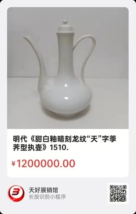 明代《甜白釉暗刻龙纹“天”字荸荠型执壶》,高21.5㎝,口径4.2㎝,圈足8.2㎝。简介:该《甜白釉暗刻龙纹“天”字荸荠扁型执壶》系明代成化年间宪宗皇帝宫廷专用饮酒器。该扁形壶似荸荠,扁腹,颈细长,曲柄连于肩腹,长水流,造型雅致。瓷器胎质轻盈薄厚均匀,白釉纯净肥润,光泽。因釉质感如白糖得名甜白釉。釉下暗刻龙雲纹,水浪纹,壶底喑刻隶书“天”字。因此执壶融合成化年制官窑甜白釉,暗刻纹,天字款,瓷胎薄如半脱脂等多项顶级工艺,堪称精品、美品!来源1510.V.