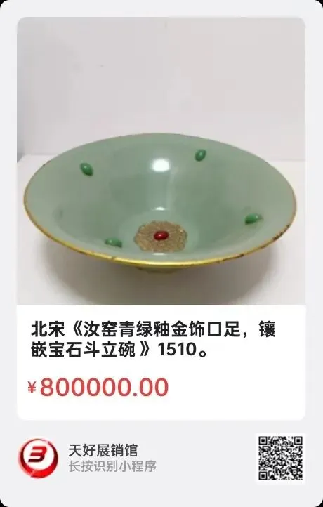 北宋《汝窑青绿釉金饰口足,镶嵌宝石斗立碗 》,高9.8㎝,口径27.7㎝,底圈足18.5㎝。3.北宋汝窑青绿色釉镶金口足,金絲镶嵌红绿色玉石斗立碗。胎质坚实,斗立型,青绿釉,釉色温润而泽,碗内金饰五颗红绿色宝石,彰显贵气,包金口足,亦称“金扣”,将实用陶瓷变为礼器应用,提升了宫碗的观赏性与价值。汝窑瓷器加之金饰镶嵌,富贵宝器与艺术眛力相得益彰,突显了宋代文人含蓄的审美观。来源1510.V。