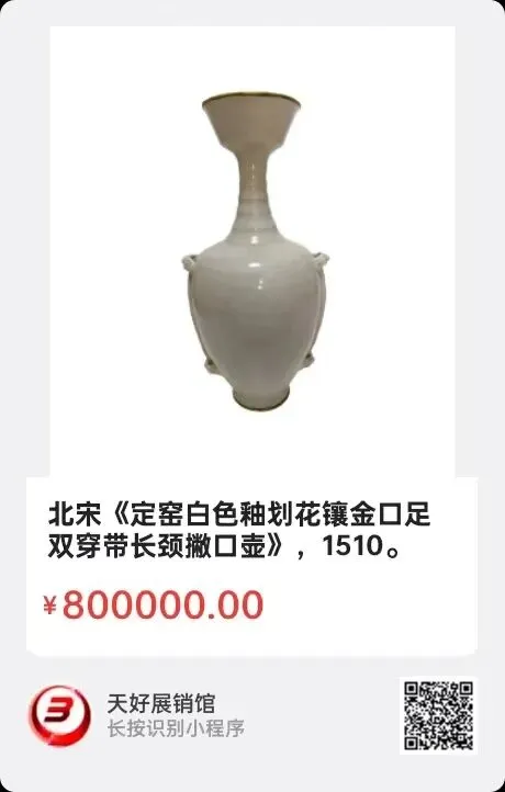 北宋《定窑白色釉划花镶金口足双穿带长颈撇口壶》,高31㎝,口径9㎝,底足6.8㎝。简介:北宋定窑白色釉划花双穿带长颈撇口壶,为实用器物,无戳记,镶金口足。白釉色温润如玉,刻划花卉纹,弘棱长颈兼手柄之用,斗型撇口为进岀水口,壶两侧双穿带孔,以系提绳之用。此瓷器造型隽永,典雅,镶金饰升高了实用器的艺术与金融价值。是宋代及金代的佳器。来源1510.V。