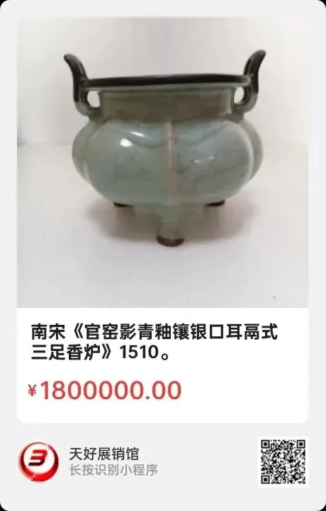 南宋《官窑影青釉镶银口耳鬲式三足香炉》,高12.5㎝,口径12㎝,三足距8㎝,宽14.5㎝。简介:南宋官窑影青釉镶银耳口鬲式三足香炉,经量子鉴定为南宋嘉熙四年,即公元1240年造,此器为三足鬲式炉,影青釉,釉色光泽细腻,造型传统秀美、雅致。炉底浮刻金字:养心殿明窗用。经鉴定为清乾隆年间补刻。至于香炉包镶银口银耳工艺,经量子鉴定为清光绪32年(公元1906年)加工制作。有人考证此镶银口耳工艺系日本上个世纪的特殊工艺,并有大量记载。此瓷器造型及各烧造,装饰工艺精湛,是南宋官窑青瓷的精品。具有极高的历史文化及收藏价值!来源1510.V。