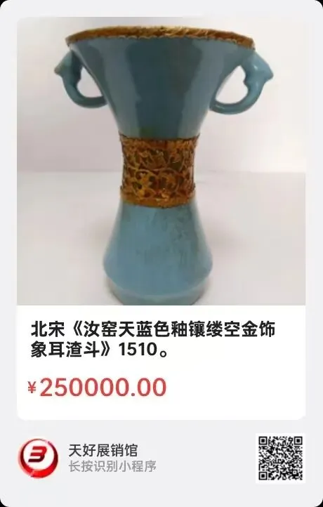 北宋《汝窑天蓝色釉镶缕空金饰象耳渣斗》,高20.4㎝,口径13㎝,底径7.2㎝。简介:北宋汝窑天蓝色釉镶金饰象耳渣斗,釉色细腻,隐现开片纹,平底撇口,象耳连腰,器型端庄稳重,金泊镂空花卉纹镶口镶束腰,尤显华贵。渣斗,自古贵族宫廷实用器,装饰金器明显是彰显皇权地位,或作殉葬品祭祀之用。来源1510.V。