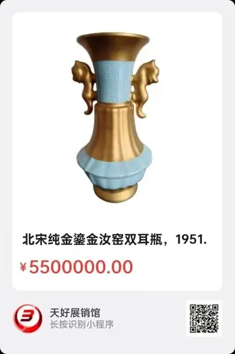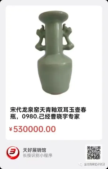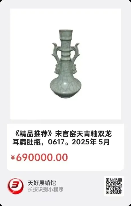 宋官窑天青釉双龙耳扁肚瓶,口径:4cm底部:7cm高度:23cm,2025年 5月 21日,经天好评审团评审,以6票优势荣登精品榜,获第172期天好海选精品。来源0617.V.