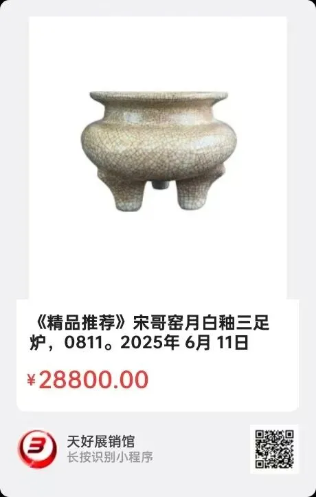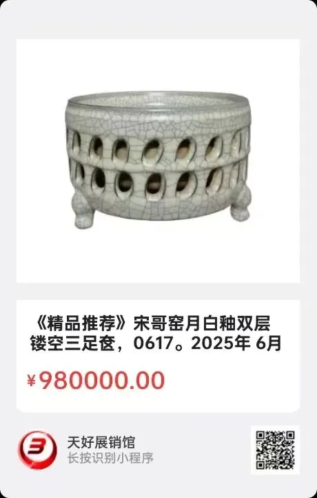 宋哥窑月白釉双层镂空三足奁,口径:16.8cm底部:16.5cm高度:11cm,2025年 6月 11日,经天好评审团评审,以6票优势荣登精品榜,获第174期天好海选精品。来源0617.V.