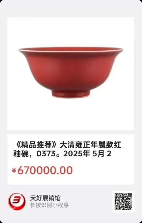 明宣德红釉十梭碗,高度,11.6公分左右,口径,15.2公分左右,底足,8公分左右。明代宣德红釉瓷器本身就极为珍贵,烧成条件苛刻,且流传至今数量稀少,十梭的造型又使其更具独特性。从近年来的二级巿場趋势情况来看,宣德红釉碗一直是收藏家和投资者追捧的对象,市场需求极为热捧。2025年 6月 18日,经天好评审团评审,以6票优势荣登精品榜,获第175期天好海选精品。来源1912.V.
