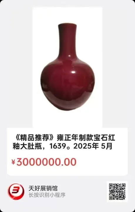 雍正年制款宝石红釉大肚瓶,高48cm,宽33cm,口径11cm,脖子长19cm,足底直径16cm,2025年 5月 21日,经天好评审团评审,以6票优势荣登精品榜,获第172期天好海选精品。来源1639.V.