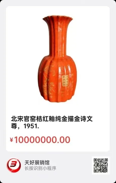 北宋《钧窑玫瑰紫色釉镶嵌金饰出戟尊》,高26㎝,口径23.2㎝,底足15.5㎝。5.简介:北宋钧窑玫瑰紫色釉镶金饰出戟尊,底酱色釉,“一”字款,撇口天青釉蚯蚓纹,尊内外施满釉,窑变形成的瓷器表面不同的紫色斑纹,釉色鲜艳秀美,突显雍容瑰丽。瓷胎厚重,端庄,四面出戟,造型仿青铜器,古朴典雅。此瓷尊沿口镶金絲编织的衣形装饰(鉴定为纯金),有国外金饰工艺之说。此瓷器历史攸久,为北宋钧窑瓷器之精品,具有极高的收藏价值!来源1510.V。