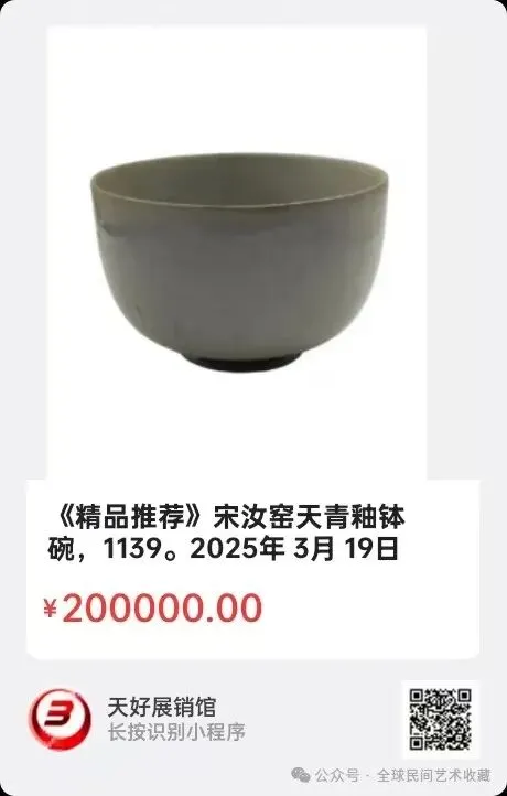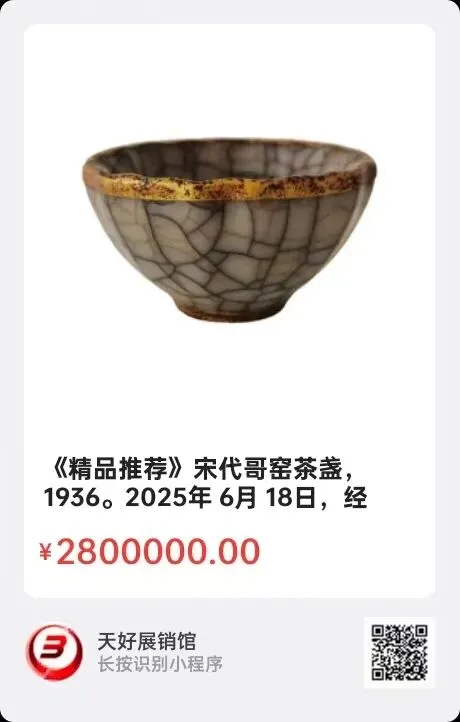 宋代哥窑茶盏,尺寸高5公分。口径8公分半。底足三公分半。2025年 6月 18日,经天好评审团评审,以6票优势荣登精品榜,获第175期天好海选精品。来源1936。