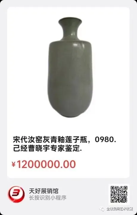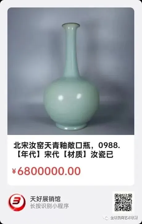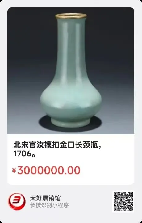 宋汝窑盘口瓶,为汝窑天青釉之绝品,器型规整秀雅,盘口直颈,丰肩圆腹,线条如行云流水,尽显宋瓷“雨过天青”之韵致。釉色莹润凝厚,呈纯正天青色,开片冰裂纹理自然天成,如蝉翼轻展,触之细腻如脂,观之澄澈似玉。底足可见典型支钉烧痕,三粒芝麻钉清晰可见,为汝窑“支钉烧”工艺之铁证,尽显北宋官窑规制之严谨。此瓶尺寸精妙,上口直径5厘米,底径5.6厘米,通高11厘米,重166.8克,一手可握,宜于掌中把玩,为传世汝窑中罕见之掌中珍玩。汝窑为宋代五大名窑之首,存世不足百件,此瓶传承有序,品相完好,历史价值、艺术价值无可估量,堪称国之重宝,价值过亿。今为回馈藏友,保真到代,错过再无此机缘,实为藏家不容错失的镇馆之选。来源2003。