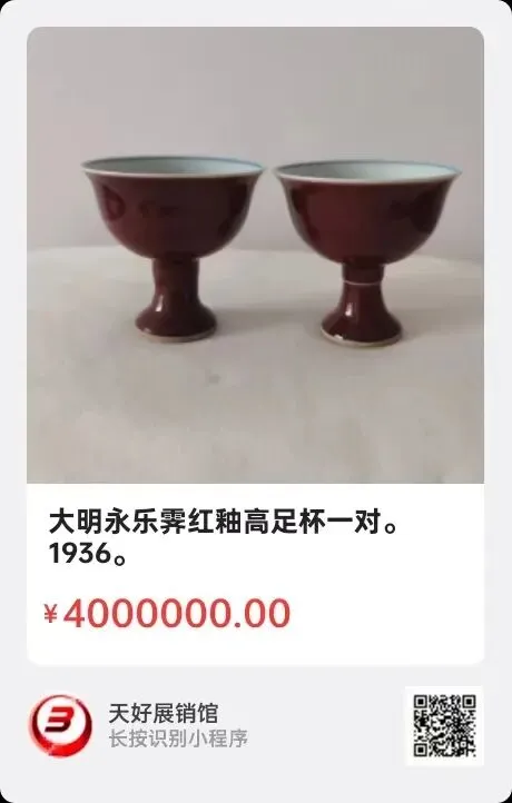 大明宣德年制款红釉十棱高足杯,口径,15公分左右,高度,11公分左右,底足,0.45公分左右。宣德红高足杯一对非常难得,颜色亮利,红色在当时烧造难度很高,保存到现在不可多得!明代宣德红釉瓷器本身就极为珍贵,烧成条件苛刻,且流传至今数量稀少,高足杯的造型又使其更具独特性。从近年来的二级巿場趋势情况来看,宣德红釉高足杯一直是收藏家和投资者追捧的对象,市场需求极为热捧。2025年 5月 28日,经天好评审团评审,以7票优势荣登精品榜,获第173期天好海选精品。来源1912.V.