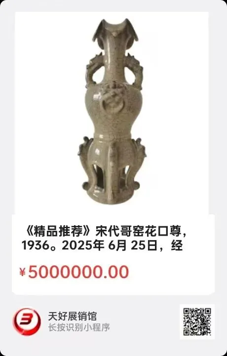 宋代哥窑花口尊,高43,口径10,低13,2025年 6月 25日,经天好评审团评审,以6票优势荣登精品榜,获第176期天好海选精品。来源1936。