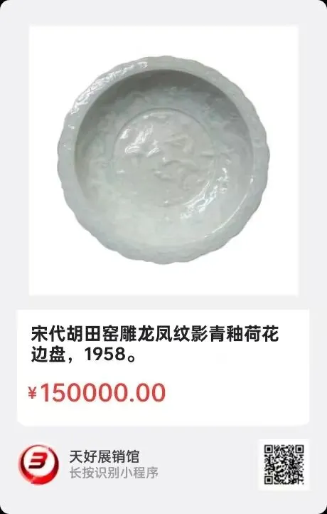 宋代胡田窑雕龙凤纹影青釉荷花边盘,雕工精细生动,釉水滋润,极多少见龙凤纹于湖田窑器物上,品相中上品,有一小窑逢。直径20厘米,高4厘米。来源1958。