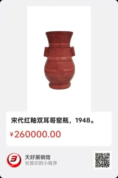 宋代红釉双耳哥窑瓶,高约23cm,口径约11cm。瓶身有独特的开片纹理。呈现出不规则的裂纹图案。增添了古朴的美感。整体造型端庄典雅。难遇的完整器型精品。来源1948。