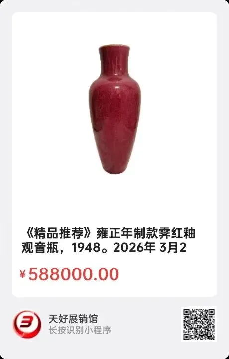 雍正年制款霁红釉观音瓶,高约41cm。口约9cm。底部约10cm。口部较直(或微撇),颈部修长-肩部丰满圆润,瓶身自肩向下逐渐收敛,线条流畅,优雅。整体比例纤细匀称,修足规整,是传统陈设瓷的经典型器型之一。通体施红釉,色泽浓艳深沉,釉面光泽莹润,带有细微的“橘皮纹”质感。此类釉色在传统中归属祭红(霁红)或郎窑红体系。底款为方形印章款,“雍正年製”(四字篆书)。收藏价值极高。2026年 3月25日,经天好评审团评审,以7票优势荣登精品榜,获第203期天好海选精品。来源1948。