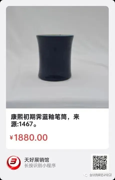 康熙初期霁蓝釉笔筒:高:12cm瓶口直径:10.3cm底足直径:9cm。来源:1467。