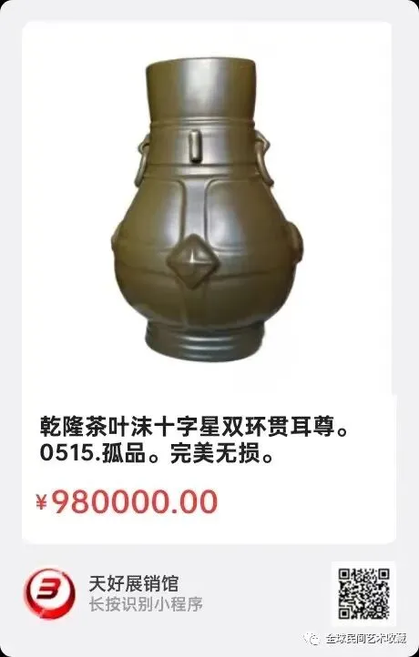 乾隆茶叶沫十字星双环贯耳尊。高33公分。孤品。完美无损。来源:0515。