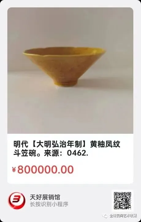 明代【大明弘治年制】黄秞凤纹斗笠碗。高7厘米口径15厘米底径5厘米,来源:0462.