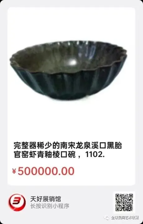 完整器稀少的南宋龙泉溪口黑胎官窑虾青釉棱口碗 尺寸:10厘米。此碗品相完好,经本平台鉴定专家曹晓宇老师鉴定为难得一见的南宋龙泉溪口黑胎官窑完整器真品。精品。极具收藏把玩价值和溪口官窑完整器实物研究价值和经济价值。来源:1102。
