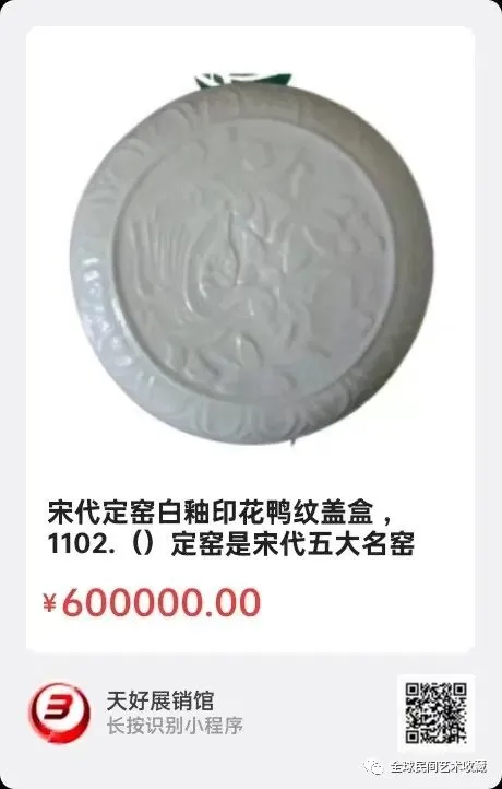 宋代定窑白釉印花鸭纹盖盒 , 尺寸 直径11厘米。定窑是宋代五大名窑之一,以淡雅洁白的釉色和古拙简朴的造型闻名世界。此盖盒经本平台鉴定专家曹晓宇老师鉴定为定窑真品、精品。具有较好的收藏把玩价值和经济价值。来源:1102。