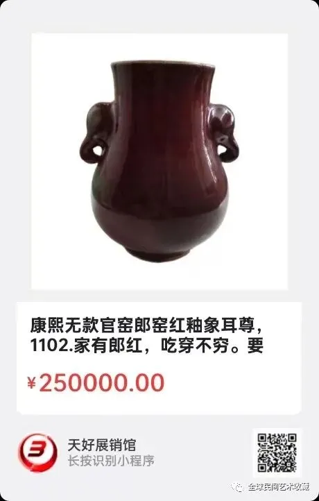 康熙无款官窑郎窑红釉象耳尊 尺寸:腹径11厘米,口径7厘米,足径6,5厘米。家有郎红,吃穿不穷。要想穷,烧郎红。这是古代烧瓷人对郎红釉瓷器的评价,此尊造型规整,施釉肥润,釉色高档名贵,釉面光亮,有玻璃光泽,鲜红如牛血,烧制难度极高,成品率极低,成本昂贵,存世不多见,包浆自然,品相完好。经本平台鉴定专家曹晓宇老师鉴定为清早期无款官窑真品,具有较好的陈设把玩和收藏价值。来源:1102。