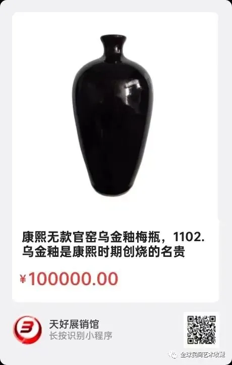 康熙无款官窑乌金釉梅瓶 ,尺寸:腹经8,5厘米 高16厘米。乌金釉是康熙时期创烧的名贵品种。乌金釉一直以来在收藏界价格很高,它的美无与伦比,早已被收藏家们认知。“清三代”的官窑乌金釉更加受到市场热捧,首先是由于“清三代”的瓷器烧制技术已经成熟,再加上康、雍、乾三朝帝王对瓷器的热爱,投入了大量的人力、物力、财力精心制作,其次“清三代”的御用瓷器必须经过督窑官的精心挑选,如有瑕疵立即销毁,所以民间极少流传,存世数量并不多,目前市场价格较高,并且具备很大的升值潜力。施釉肥润,釉色漆黑,釉面发光,美感十足,包浆自然,品相完好。经本平台鉴定专家曹晓宇老师鉴定为清早期康熙无款官窑瓷器真品、精品。极具陈设、把玩和收藏价值。来源:1102。