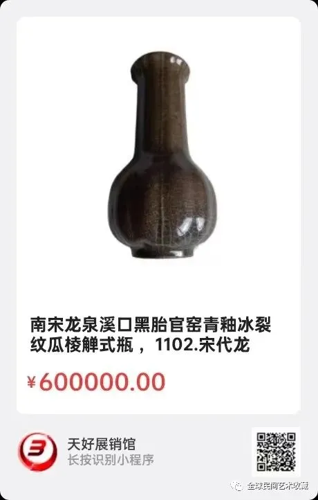 南宋龙泉溪口黑胎官窑青釉冰裂纹瓜棱觯式瓶 尺寸;16厘米。宋代龙泉溪口黑胎官窑完整器非常罕见,珍贵。此瓶品相完好,经本平台鉴定专家曹晓宇老师鉴定为到代真品,具有较高的实物研究价值和收藏投资价值。来源:1102。
