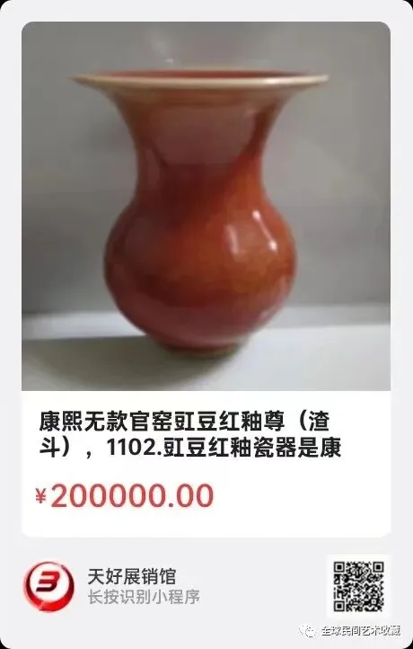 康熙无款官窑豇豆红釉尊(渣斗) 直径尺寸:直径11,5厘米 高13厘米 ,豇豆红釉瓷器是康熙时期的官窑名贵品种,烧制难度极高,釉色达标率极低,一是无大器 二是质量合格率太难,,三是存世量极少。是瓷器收藏界比较追捧的高档名贵品种。此尊经本平台鉴定专家曹晓宇老师坚定为到代真品。具有一定的收藏把玩、陈设观赏和艺术价值。来源:1102。