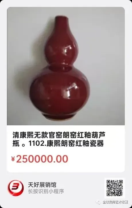 清康熙无款官窑朗窑红釉葫芦瓶 (康熙朗窑红釉瓷器均全部无款) 尺寸:17厘米 ,此瓶造型传统,器型线条优美,施釉肥厚,釉色高档名贵,釉面呈玻璃光泽,器足修胎规整,品相极佳,经本平台鉴定专家曹晓宇老师鉴定为清早期朗窑红釉瓷器真品、精品,具有较高的陈设把玩价值和收藏价值。来源:1102。