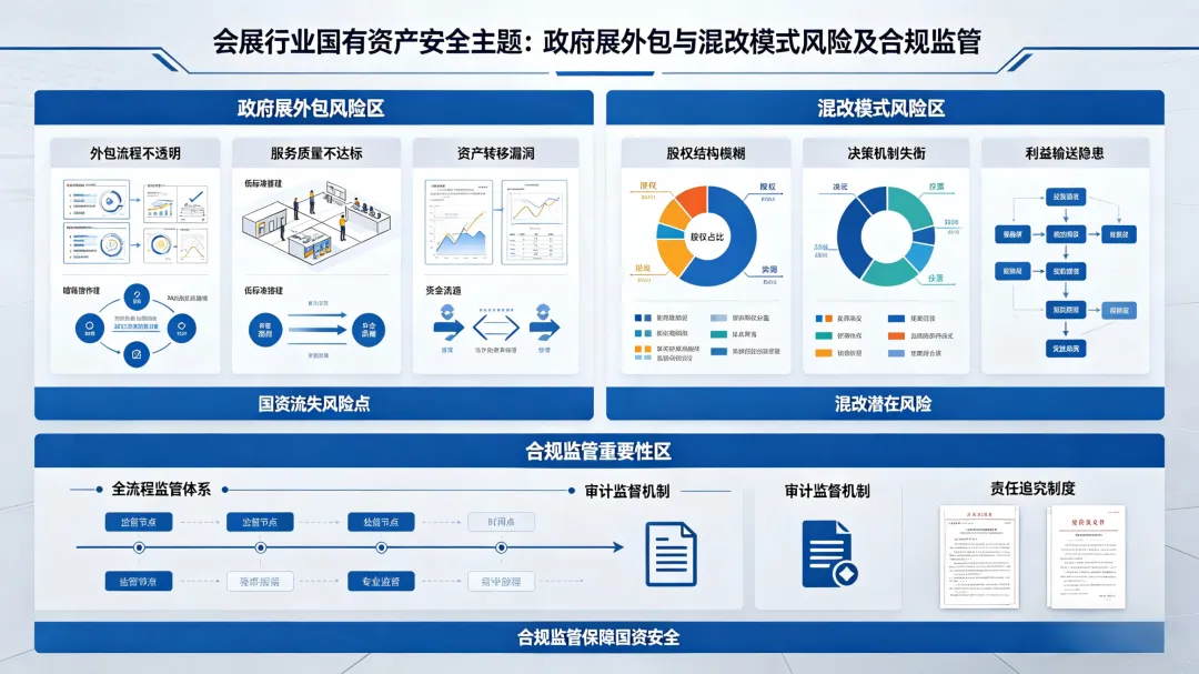 后台常收到两类提问,核心都指向国有资产流失风险:一是国家级重点政府展外包民企运营,是否会造成国资流失?二是地方国有会展集团崛起后,前几年流行的“国资+民资”混改会展公司,是否已过时?今天就结合这两个问题,谈谈我的担忧。我认为,政府重点展会外包民企,不仅可能造成国资流失,更是高风险合规雷区。国家级展会IP是国家长期投入财政、行政资源打造的国有无形资产,外包看似借力民企市场化能力,实则漏洞突出。其一,估值定价无公允标准。展会品牌、资源等无形资产难以科学估值,外包服务费全靠协商,无第三方公开评估,易出现低价处置国资的情况。其二,利益输送空间隐蔽,部分项目招标不透明、暗箱操作,变相让利民企,审计易查出违规问题。其三,品牌易失控,民企逐利可能压缩成本、降低品质,导致政府展会口碑受损,无形资产贬值比资金损失更难挽回。其四,监管缺位,民企决策灵活,资金、成本难以全程监管,易出现“盈利归民企、亏损归国资”的失衡局面。再看混改会展公司,其黄金时代已过。前几年,国资出场地、政策、品牌,民企出能力,看似双赢,实则存在根本矛盾:民企不会将核心资源注入合资公司,优质人才、渠道、客户只会优先倾斜自身业务,合资公司对其只是盈利项目。最终往往是国资真金白银投入,民企浅尝辄止、赚快钱;双方决策效率、核心诉求不一致,易出现利益扯皮、关联交易,最终受损的还是国资。本质上,国资求安全合规、保值增值,民企求短期利润、灵活高效,目标相悖难以同心。说到底,两类模式的核心矛盾都是国有资产安全。当前会展行业规范化、国资监管收紧,无论哪种运营模式,唯有坚守合规、明确权责、强化监管,才能避免国资流失,推动行业健康发展。
