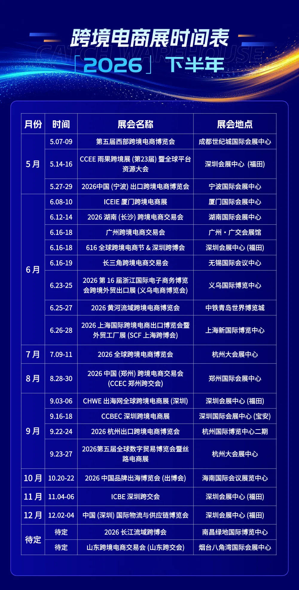 选品对接、资源整合、趋势研判,展会是跨境人的核心阵地。凯琦海外仓特别整理《2026年跨境行业核心展会名录》。覆盖深圳、杭州、广州、上海等核心外贸城市重点展会。