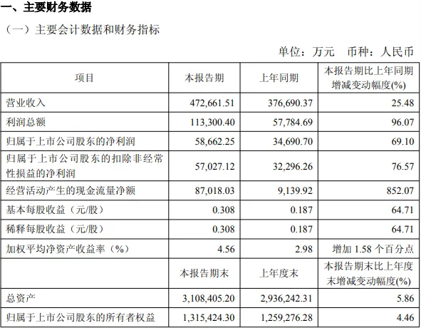 利润总额11.33亿元,同比增长96.07%;归属于上市公司股东的净利润5.87亿元,同比增长69.1%。