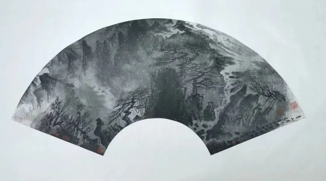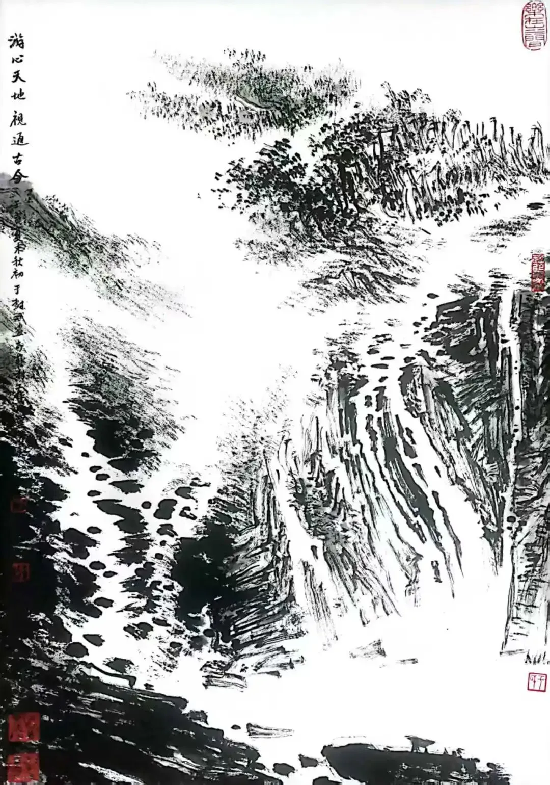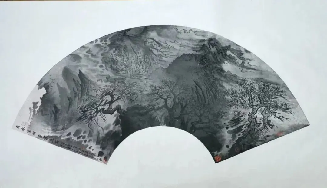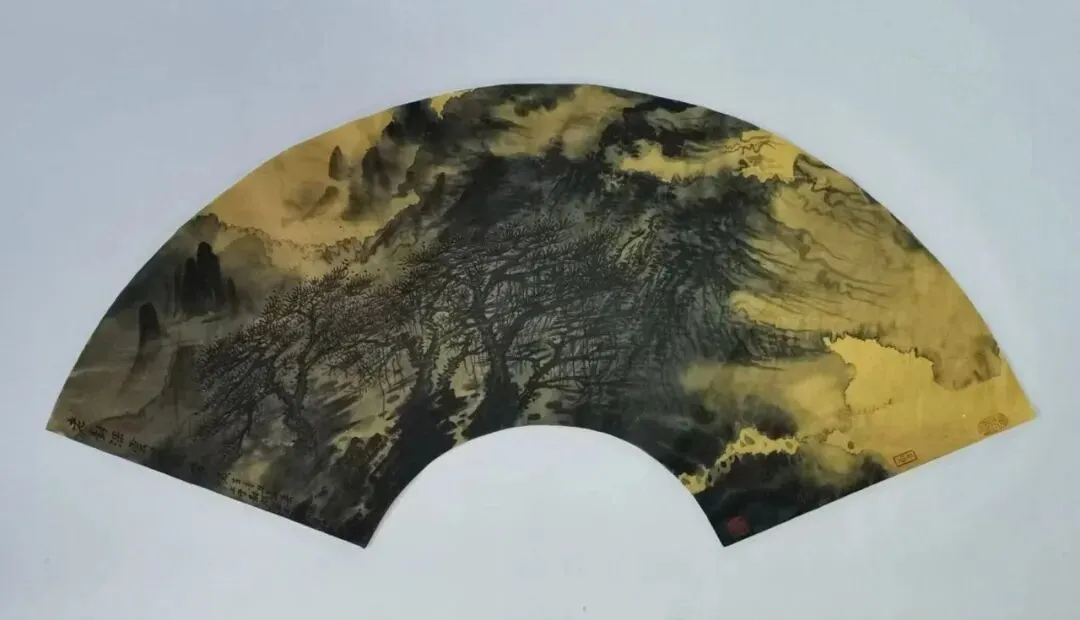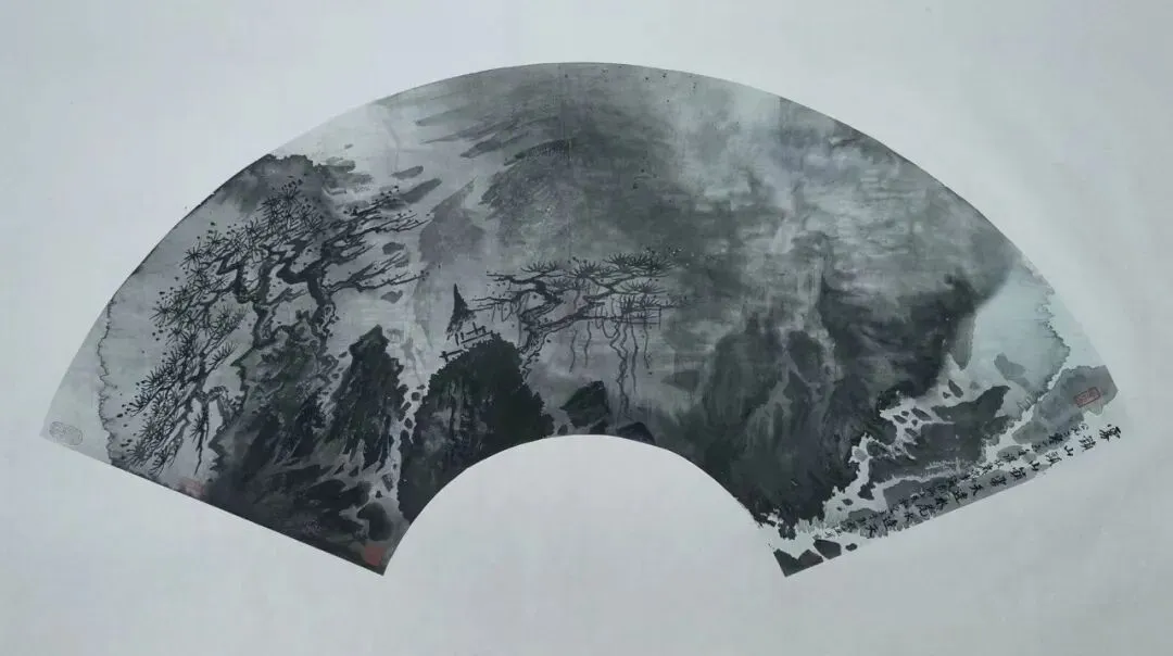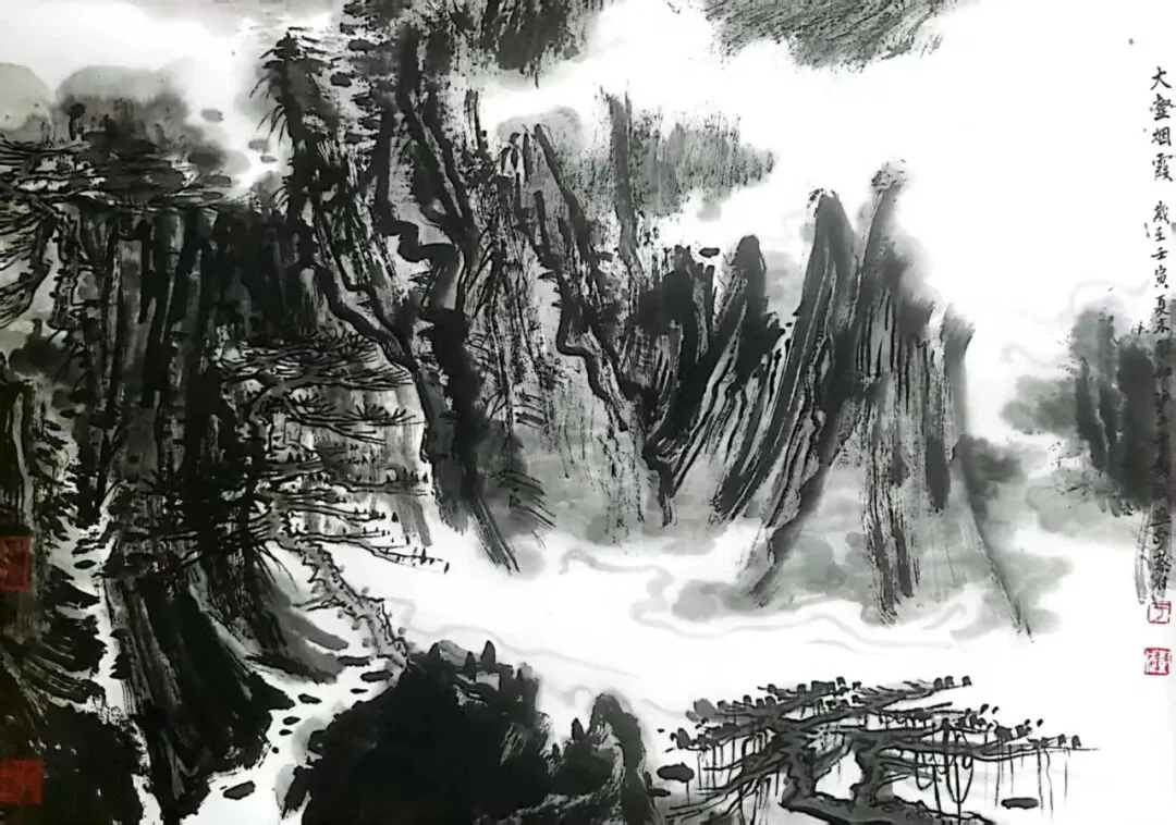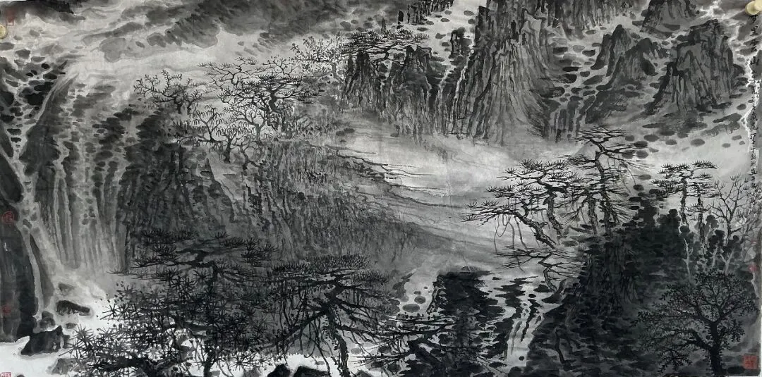 当我们深入探究其笔墨技法时,发现在苍茫洪濛的墨韵中潜藏的,是开合掩映的构图经营,是华夏山河的貌离神合,是顿挫劲挺的笔法和泼洒自如的墨法。这格局、这气势、这笔墨,形成了浑然的交响。这浑然交响的境界,既具前人的传统韵味,又不重复前人的模式和符号。