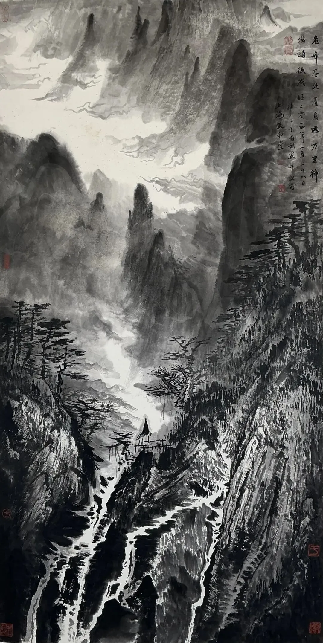 于树斌教授是一位兼擅学术研究与绘画创作的艺术家,早年精研素描艺术与教学,著有《素描教学范例》等颇有影响力的书籍,同时将素描黑白灰造型理念融入中国画中为其独创的山水画变革奠基。自2011年起,他以“江山”为创作母题,开创“水墨泼写”新模式,融合传统六法与现代构成原理,借泼墨肌理与笔墨意趣,表现大自然的凝重浩瀚。其作品取材山水云雾、四时景致,却非实景写生,而是抒发胸中意象,蕴含老庄哲思,传递“乾坤太和”的宏大主题,作品兼具现代视觉张力与传统诗意,本次于树斌个展呈献给大家的力作,尽显其“静听天和”的艺术境界与学者型画家的独特修养。
