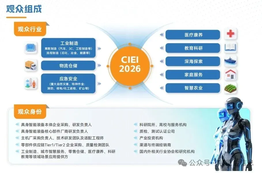 上海国际具身智能产业博览会(简称CIEI2026)——聚焦“具身智能”全产业链的前沿融合型国际展会平台,CIEI2026旨在构建一个超越传统展览的价值新枢纽。将以 “技术革新” 为支点,“生态融合” 为脉络,不仅汇聚全球前沿科技与顶尖企业,更深耕于商务合作、理念共创与未来洞察的核心场景。在CIEI2026,全球产业链资源将被高效链接,从关键技术、核心部件、系统集成到多元场景应用,形成闭环。我们全力推动人机协同从概念走向广泛落地,加速产业生态的系统性升级,共同缔造一场定义智能装备未来图景的世界级思想与产业盛宴。